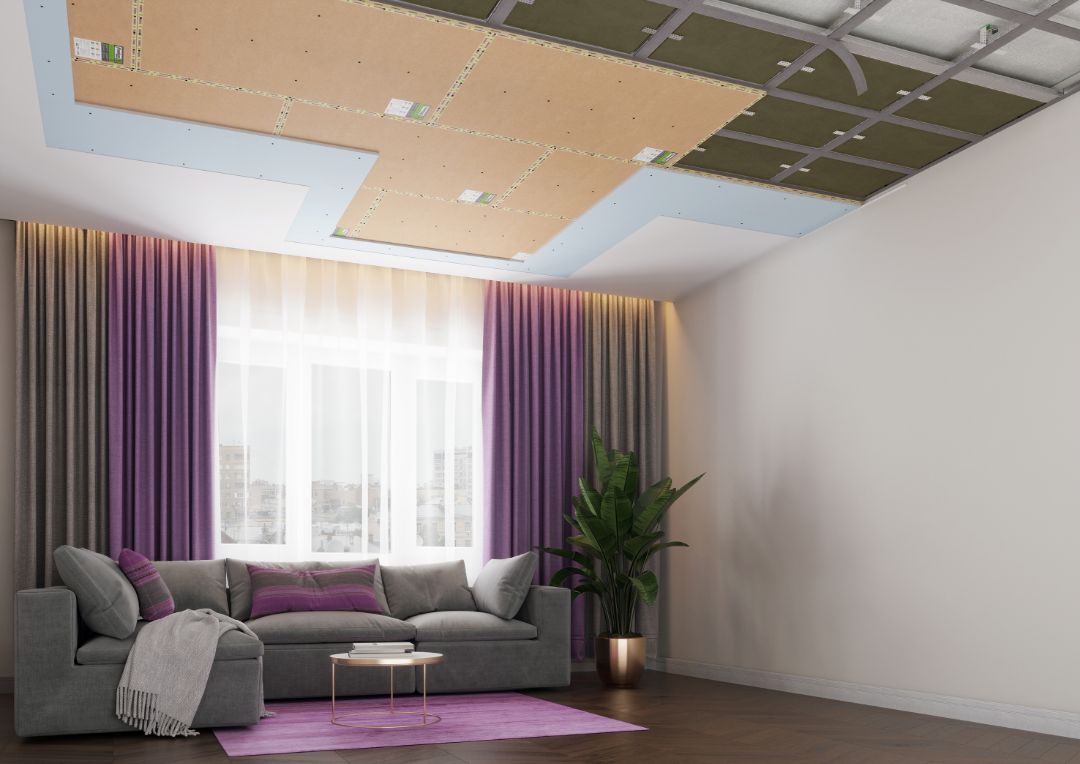 Толщина каркасной звукоизоляции потолка от 5см до 8 см. В состав решений входят виброизоляционные подвесы и подложки, звукоизоляционные панели с кварцевым песком, профессиональные демпферные ленты, звукоизоляционные базальтовые плиты.
