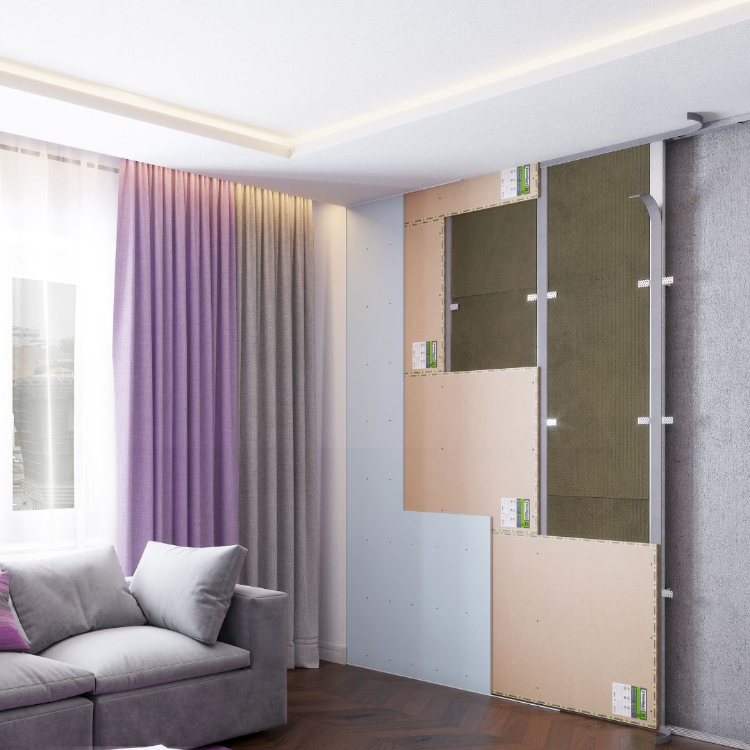 Толщина каркасных звукоизоляционных перегородок от 5 см до 8 см. В состав решений входят звукоизоляционные панели с кварцевым песком, звукоизоляционные базальтовые плиты, подрозетники.